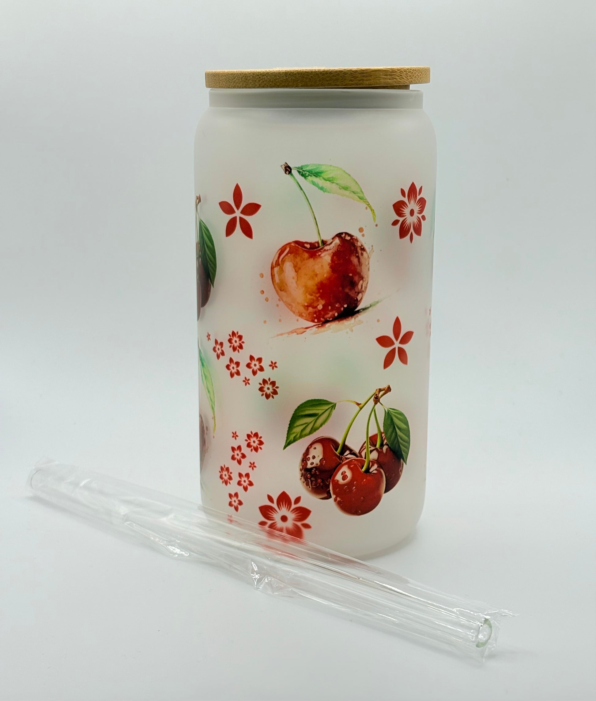 Bring a touch of sweetness to your sip with this cherry-themed frosted glass can! Decorated with watercolor-style cherries and tiny red blossoms, this retro-inspired tumbler is perfect for iced coffee, tea, matcha, smoothies, or any refreshing drink.