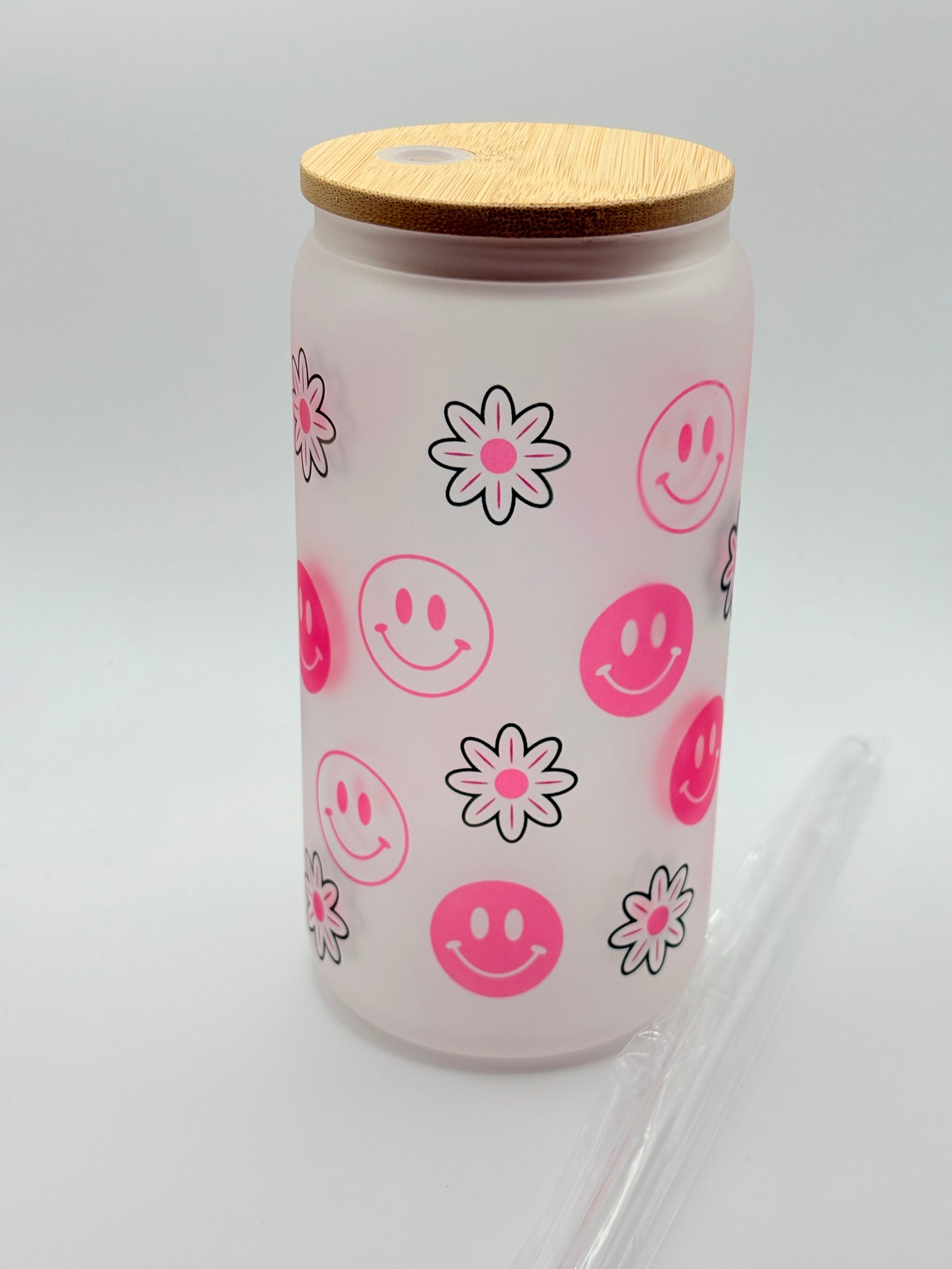 Sip in style with this adorable glass can cup featuring a retro-inspired pink smiley face and daisy design. Perfect for iced coffee, tea, matcha, smoothies, or your favorite cold drinks, this frosted glass tumbler brings a cheerful pop of color to your daily routine.